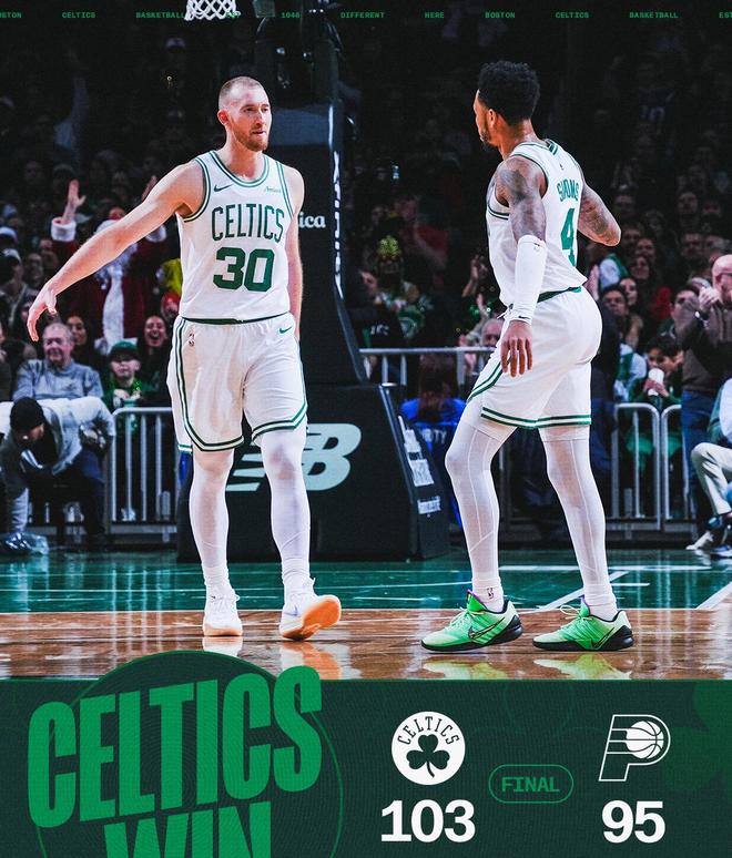印第安纳在攻防两端陷入被动,只有领先单打取分,防守端又顾此失彼。绿军轰出了27比9的攻势,将分差扩大至10分,就此锁定大局。距离终场仅剩41.9秒,卡莱尔换下首发,选择提前弃子认负,比赛就此失去了悬念。最终,凯尔特人以103比95力擒步行者,上演了20分超级大逆转好戏。